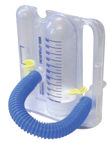 The device is used in the training of the respiratory muscles as part of the exercises of respiratory rehabilitation. It is equipped with markers to indicate the goal volume and the results obtained. It is ergonomic and easy to handle with hand grips on both sides and the filters on the base of the device can be removed and disinfected. The tube and mouthpiece can be inserted in the upper slots when the device is not being used.