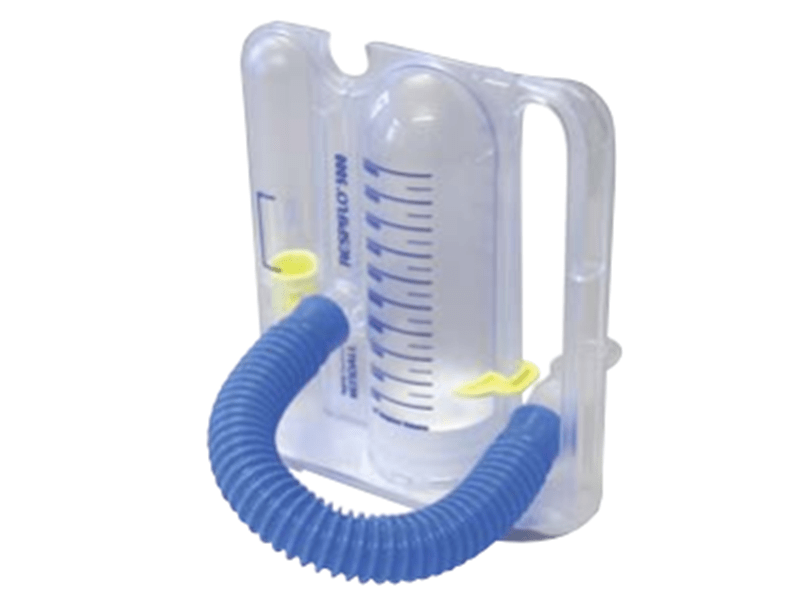 The device is used in the training of the respiratory muscles as part of the exercises of respiratory rehabilitation. It is equipped with markers to indicate the goal volume and the results obtained. It is ergonomic and easy to handle with hand grips on both sides and the filters on the base of the device can be removed and disinfected. The tube and mouthpiece can be inserted in the upper slots when the device is not being used.