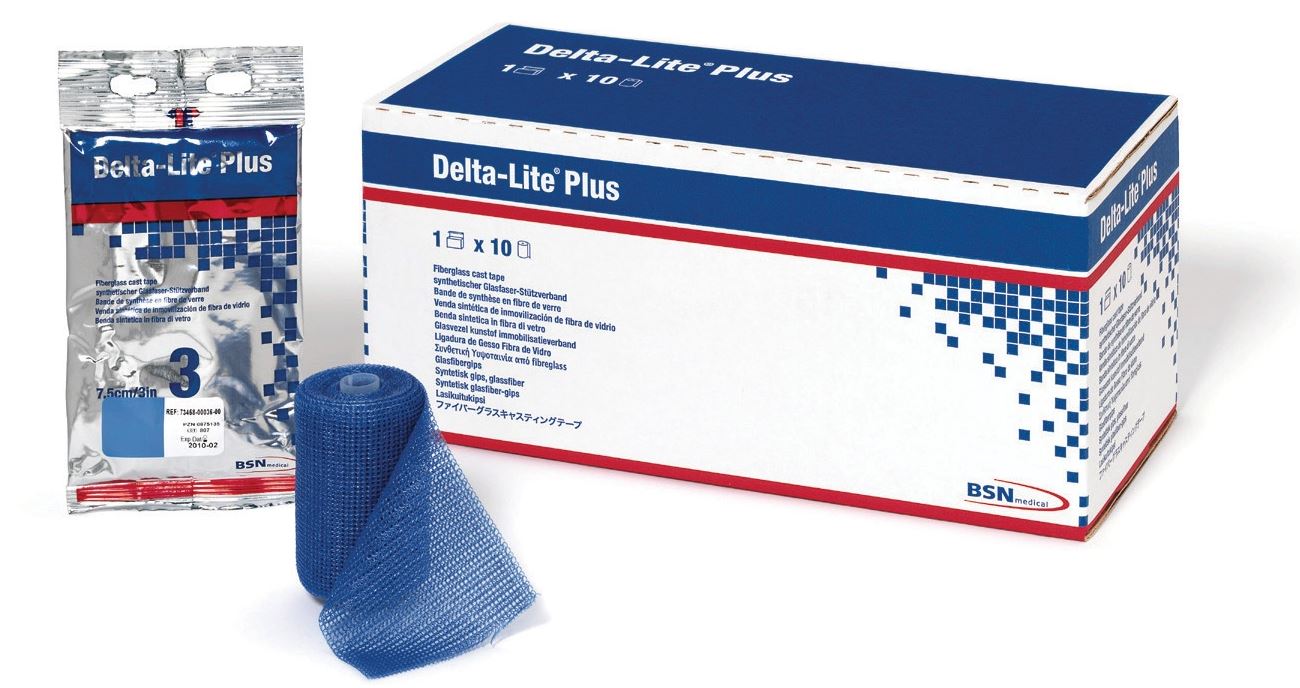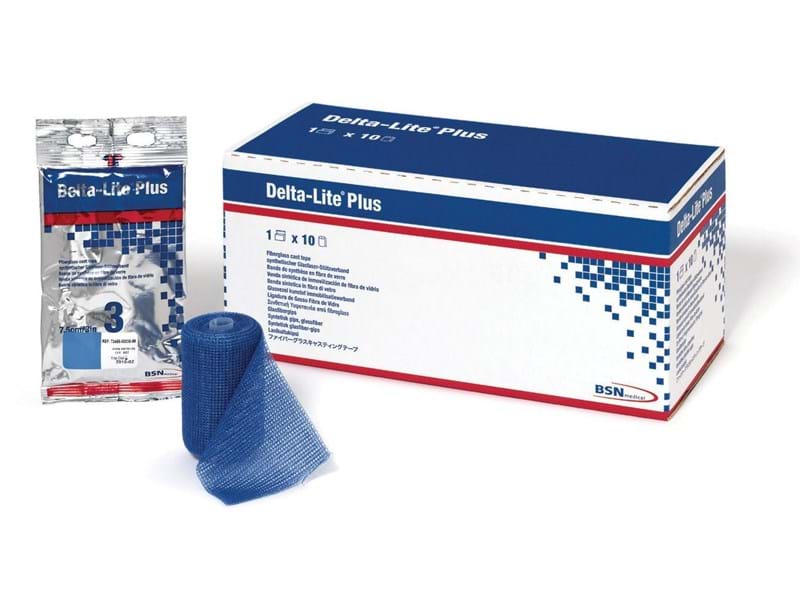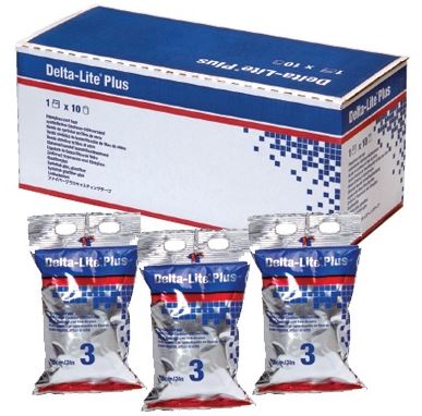 Delta-Lite Plus is a fibreglass cast tape that combines a fibreglass substrate and advanced water activated polyurethane resin system which provides tack free properties. The tack free properties allow ease of application and moulding using standard examination gloves. No longer required are the 'purple' gloves.