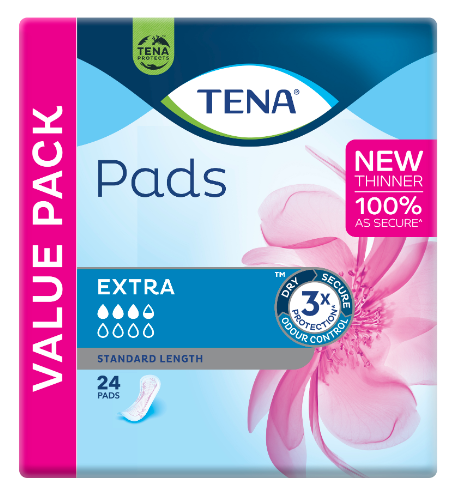 TENA Extra Pads Standard Length is specifically designed for women with a close body fit for added security and comfort.