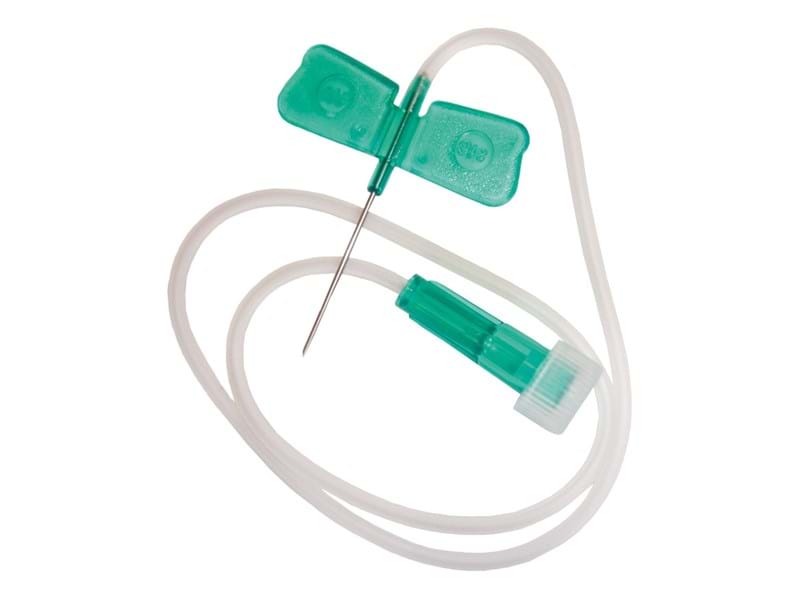 Wing is angled for ease of positioning of the needle during venipuncture, for less risk of vessel damage or occlusion of the lumen.