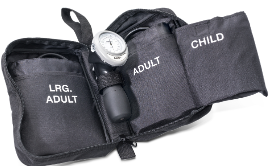 Case measures a compact 8” x 6” x 2” that can easily be stored in most emergency boxes and trauma kits 3 cuff model includes adult, child, and large adult Adcuff™ nylon cuffs and one-tube bladder with quick release luer slip connector