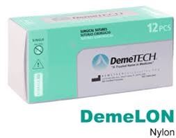 DemeTech's Nylon suture is a non-absorbable, sterile surgical suture composed of the long chain aliphatic polymers Nylon 6 and Nylon 6.6. DemeTech's Nylon sutures are available in either black or blue, dyed with FDA listed dye(s). This process is usually followed by gradual encapsulation of the suture by fibrous connective tissue. While DemeTech's Nylon is not absorbed, progressive hydrolysis may cause a gradual loss of up to 20% in its tensile strength each year. DemeTech's Nylon sutures are indicated for use in general soft tissue approximation and/or ligation, including use in cardiovascular, ophthalmic, and neurological procedures.