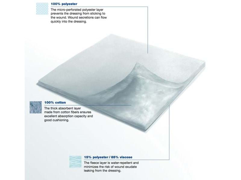 The extra-thick absorbent cotton core has high absorption capacity. At the same time, the water-repel- lent layer on the reverse prevents wound exudate from leaking.