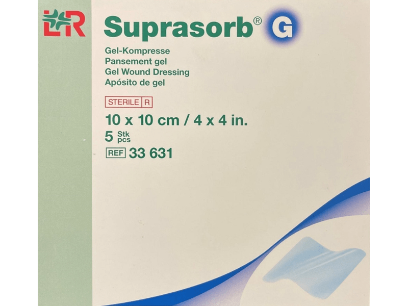SUPRASORB G GEL DRESSING 10x10cm Suprasorb® G Gel Wound Dressing is a non-adhesive, high water content hydrogel dressing. Suprasorb® G Gel Wound Dressing may be used as a wound contact layer, providing cooling and soothing as well as exudate absorption and retention. Primarily for burns, scalds, radiation therapy damage, epidermal damage and leg ulcers, Suprasorb® G Gel Wound Dressing can also help manage nociceptive wound pain and assist in autolytic debridement by hydration of necrotic and sloughy tissue. Suprasorb® G Gel Wound Dressing is suitable for use on painful wounds, and it may be used with secondary dressings where appropriate. Suprasorb® G Gel Wound Dressing can be used under compression on moderate to highly exuding wounds.